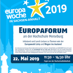 Hinsichtlich der Europawahlen möchten wir euch gemeinsam mit der Hochschule Merseburg und dem Europe Direct Informationszentrum Halle für das Thema in der Region sensibilisieren und laden euch herzlich zu unserem Europaforum ein.
